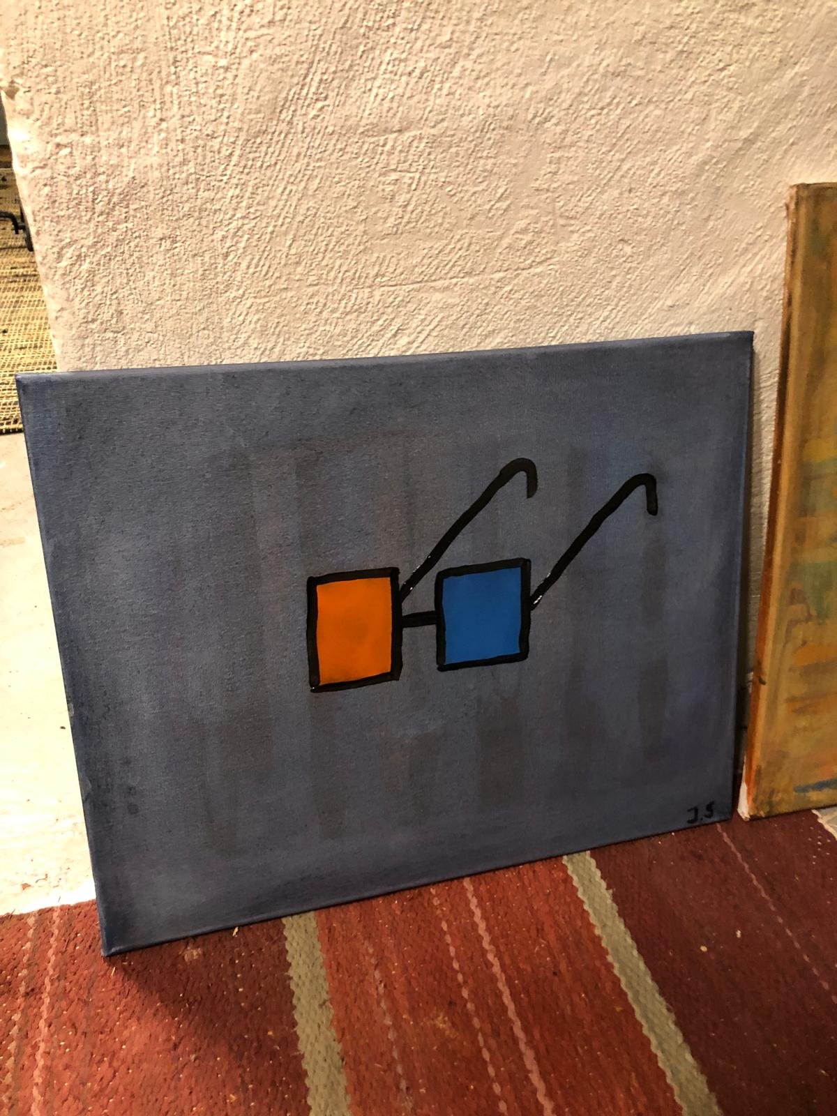 Denna målning har en minimalistisk och abstrakt stil, vilket direkt fångar blicken genom sin enkelhet och de kontrastrika färgerna. Bilden består av två färgfält, en orange och en blå kvadrat, sammanlänkade genom svarta linjer som skapar en visuell association till glasögon. Den mörkgrå bakgrunden ger en neutral och diskret bas som framhäver färgblocken. Konstverket är signerat med initialerna "J.S." vilket antyder en personlig prägel.